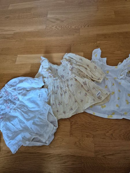 Tre söta babyklänningar. En vit med broderade blommor och spetsdetaljer, en gul med blommönster och lång ärm, och en vit med citroner och volangärm.