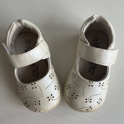 Söt, handstickad klänning i rosa och vitt med ett vågigt mönster. Klänningen har korta ärmar och en knapp vid halsen.