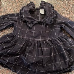 Svart klänning med lång ärm och knappar framtill. Klänningen har en avskärning i midjan med en rynkad kjol.