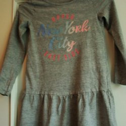 Grå klänning med lång ärm och tryckta hjärtan i olika färger. Klänningen har en avskärning i midjan med en rynkad kjol.