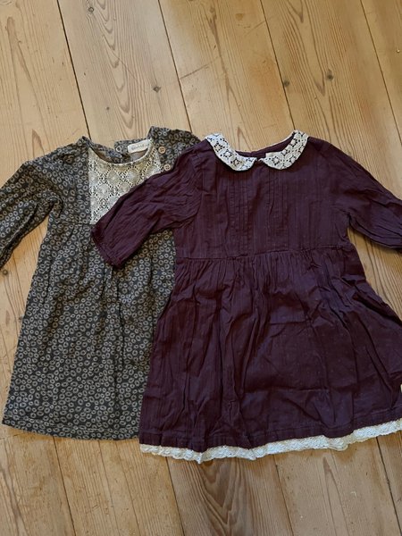Ett set med två söta klänningar. Den ena är mörk plommonfärgad med vit spetskrage och spetskant nedtill. Den andra klänningen har ett blommigt mönster i grå toner och en vit spetsdetalj framtill.