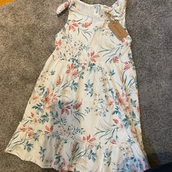 Vit klänning med ett blommigt mönster i rosa och gröna toner. Klänningen har korta puffärmar och en rynkad midja. Volang nedtill.