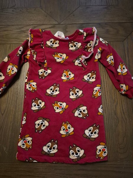 Söt klänning med långa ärmar och ett mönster av Piff och Puff. Klänningen har volangdetaljer vid axlarna.
