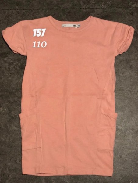 Ljusrosa klänning med korta ärmar och två fickor fram.