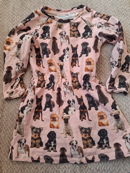 En rosa långärmad klänning med ett lekfullt mönster av olika hundvalpar. Klänningen har en resår i midjan.
