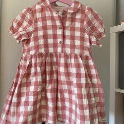 Söt rosa klänning med vita detaljer. Klänningen har korta ärmar och ett fint mönster. Stl 98.