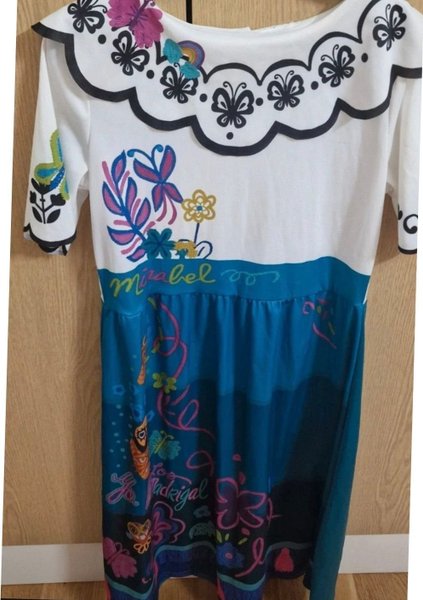 Vit klänning med tryck av fjärilar och blommor upptill. Nedtill är klänningen blå med tryck av texten "Los Madrigal" och blommor.