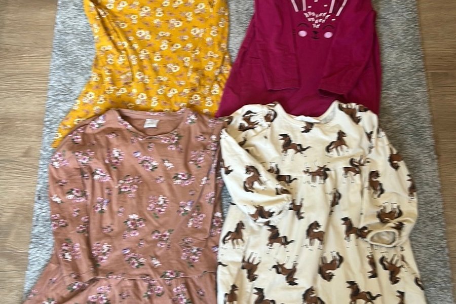 Parti med fyra långärmade klänningar för barn. En senapsgul klänning med blommigt mönster, en mörkrosa klänning med kaninansikte, en brunrosa klänning med blommigt mönster och en benvit klänning med hästmönster.
