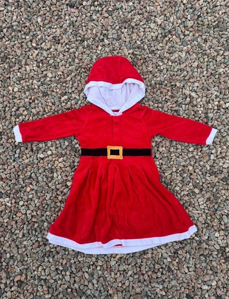 Tomteklänning med luva och långa ärmar. Klänningen har en vit kant nedtill och vid ärmsluten. Det finns ett svart bälte med ett guldfärgat spänne på klänningen.