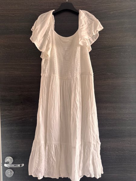 Vit klänning med smockdetaljer upptill och volangärmar. Klänningen har en avslappnad passform och en volangkant nedtill, vilket ger ett luftigt intryck. Perfekt för varma dagar eller som en somrig outfit.