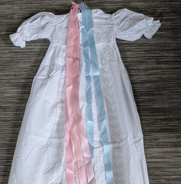 Vit dopklänning med broderade detaljer och puffärmar. Klänningen har två långa band, ett rosa och ett blått, fästa vid halsen som kan knytas eller hänga fritt. Broderierna är placerade vertikalt längs klänningens framsida och vid ärmsluten.