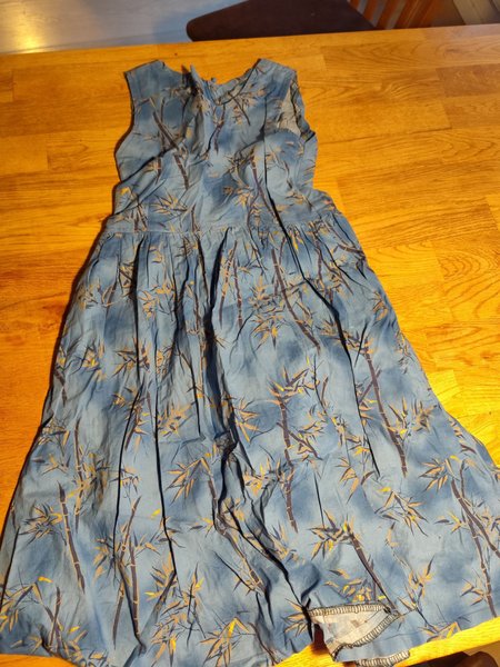 Klänning med bambumönster. Klänningen har en rundad halsringning och ärmlös design. Midjan är markerad med rynkningar som ger en fin vidd till kjoldelen. Klänningen stängs med en dragkedja i ryggen.