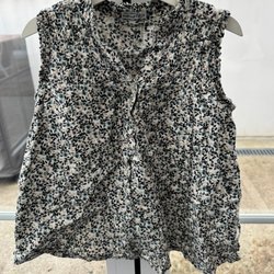 Klänning med korta ärmar och rund halsringning. Klänningen har ett blommigt mönster över hela tyget och är designad med veckdetaljer framtill. Saknas en knapp bak, se bild. Ser ut som en konstig fläck på bild två men den finns inte.