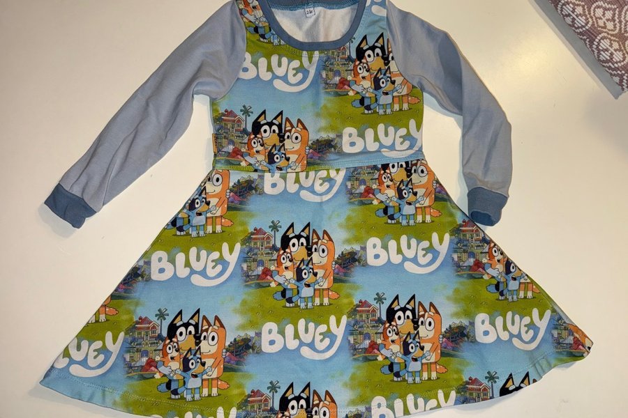 Säljer en hem sydd klänning med Bluey print