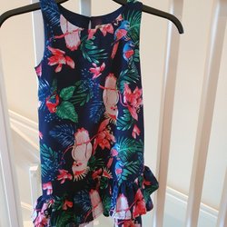 Festlig klänning med vit överdel och kjol med rosa blommor. Klänningen har ett rosa band i midjan med en stor rosa blomma framtill och en rosett baktill.