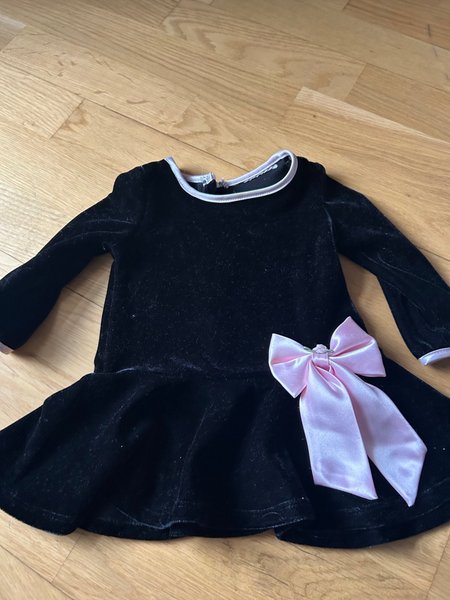 Svart klänning med långa ärmar och en volangkant nedtill. Klänningen har en stor rosa rosett fäst vid midjan, vilket ger en festlig touch. Halsringningen är rund med en vit/rosa kant som matchar rosetten.