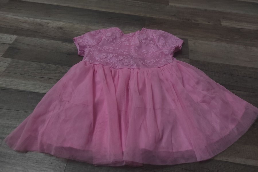 En söt rosa klänning med spetsdetaljer. Klänningen har en vid kjol och korta ärmar. Klänningen är skarpare råsa än på bilden.