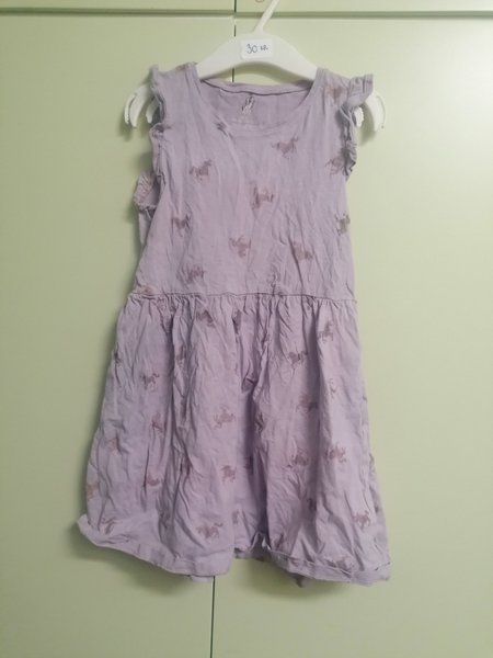 Söt lila klänning med hästar på. Klänningen har volanger vid axlarna och en rynkad kjol. Samfraktar
