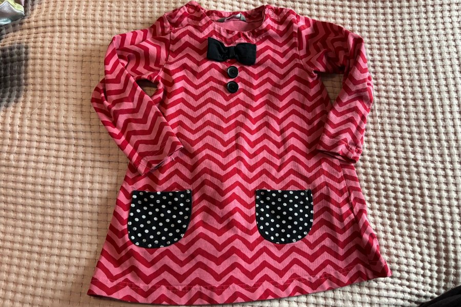 Klänning med långa ärmar. Klänningen har ett sicksackmönster i två nyanser av rött. Upptill finns en svart rosett och två svarta knappar. Nertill finns två fickor med svarta och vita prickar.