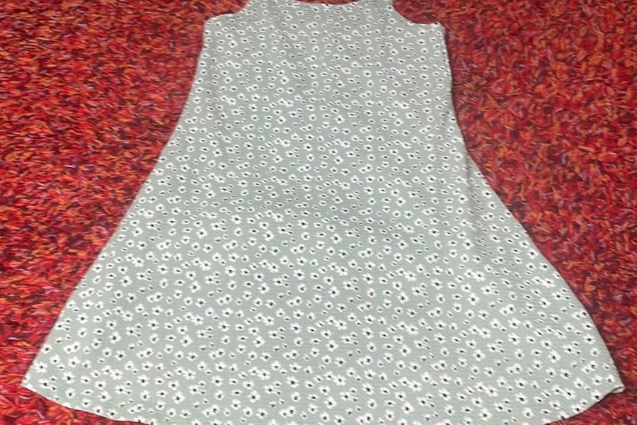 Klänning med smala axelband och ett blommigt mönster över hela plagget. Klänningen har en utsvängd passform från midjan och neråt.