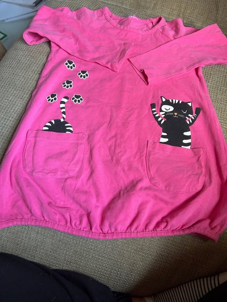 rosa färg med långa ärmar. Klänningen har två fickor framtill. På klänningen finns tryck av svarta kattassar och två katter, en som sticker upp ur varje ficka. Nederkanten resår. ”Ballongmodell” Lindex fint skick
