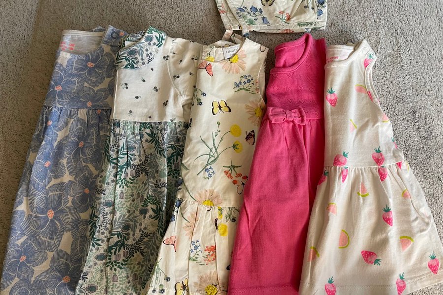 Ett set med fem klänningar och en matchande solhatt för baby. En klänning har ett blått blommönster, en annan har ett grönt blommönster. En tredje klänning är vit med fjärilar och blommor, och en fjärde är enfärgad rosa med en rosett. Den femte klänningen är vit med jordgubbs- och vattenmelonmönster. Solhatten matchar den vita klänningen med fjärilar och blommor.