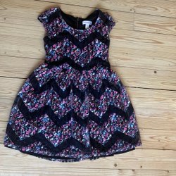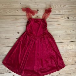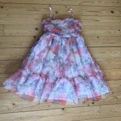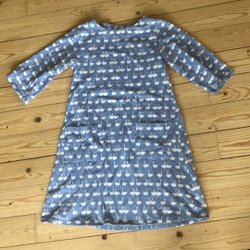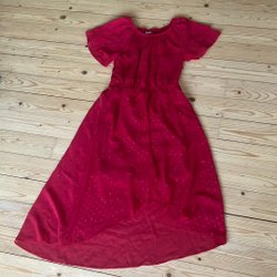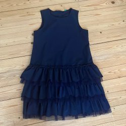 Tror det är stl 146/152. Klänningen är i fint skick. Knappbaktill och resår i midjan. 100% viskos.