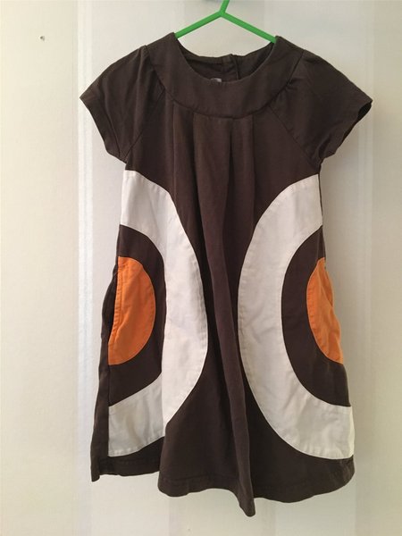 Brun klänning med mönster på, aningens tvättblekt annars fint använt skick. Storlek 98.