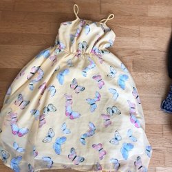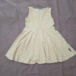 Ärmlös klänning med en figurnära passform upptill och en utsvängd kjol. Klänningen har en ljusgul färg och ett diskret texturerat mönster.82 cm lång, 27 cm i midjan 31 cm precis under armarna. Storlekslappen är borta, men till en 9-åring
