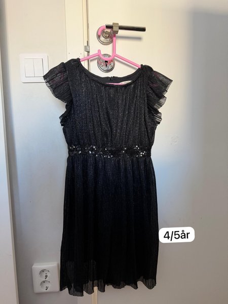 Svart klänning med korta ärmar och glittriga detaljer i midjan. Klänningen har en plisserad textur och en rund halsringning.