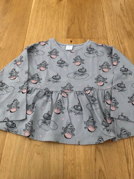 Söt grå tunika med långa ärmar och ett lekfullt mönster av grodor med kronor och partyhattar. Tunikan har en rynkad detalj som ger den en fin passform,st 104.