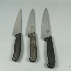 Skador: Bruksslitage, En med trähandtag har slitet handtag och fläckigt blad