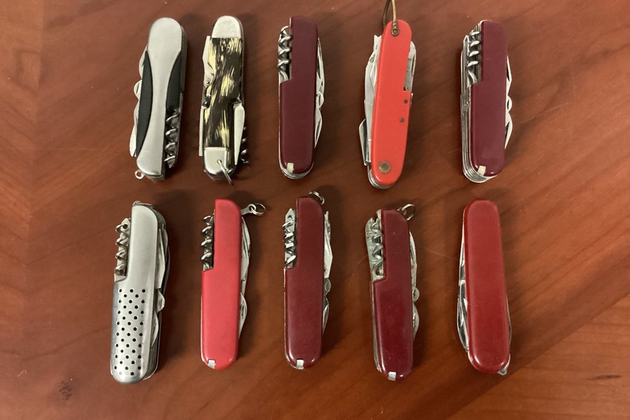 Parti med fickknivar i olika färger och utföranden. Några av knivarna har korkskruv och andra verktyg.