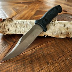 Kniven är robust och lätt att tvätta med svart blad och en ögla längst ut på handtaget för enkel utplockning.