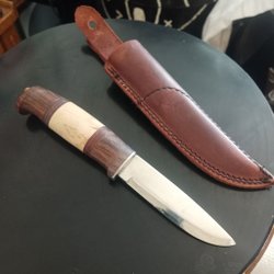 En supervacker kniv med hjorthandtag från Storbritannien. COX CO. LTD, Sheffield, England. Mycket samlarvänlig med utsökt kvalitet. Kniven är i rostfritt stål och handtaget är superfint, hel hjort med mässing, rödsvarta distanser och aluminium. Knäpp. Bladet är tjockt med svepspets och platt slipad egg. Bladet är över 13 cm långt, totalt 23 cm. Slidan finns tyvärr inte.