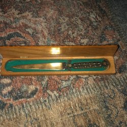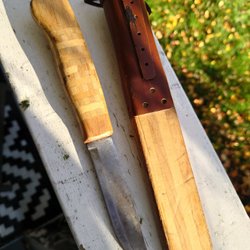 Exklusivt kniv. Finsk? Blad märkt OG. Slida märkt Kron 91. Finskt ”mynt” fäst vid slidan.