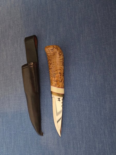 Denna kniv har ett trähandtag och levereras med ett läderskydd. Passar för olika användningsområden.