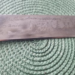 En fin liten kniv kan inte läsa namnet på bladet den är slipad någon gång 18 cm lång bladet 9 cm när jag sitter skriver ser det som signaturen börja på ett ett lång J sen kan det vara ett M