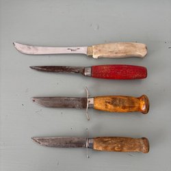 Tre Mora knivar med slidor. En liten kniv är märkt "Erik Frost Mora Sweden". En annan kniv är märkt "KJ Eriksson Mora Sweden Carbon Steel". Den tredje kniven är märkt "Mora of Sweden Stainless Steel" och har ett blått handtag märkt "Luna".
