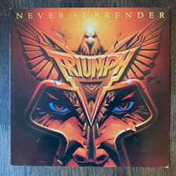 Vinylskiva med Triumph – Never Surrender. Omslaget har en bild av en örnliknande figur i orange och brunt med texten "NEVER SURRENDER" överst och "TRIUMPH" i mitten.