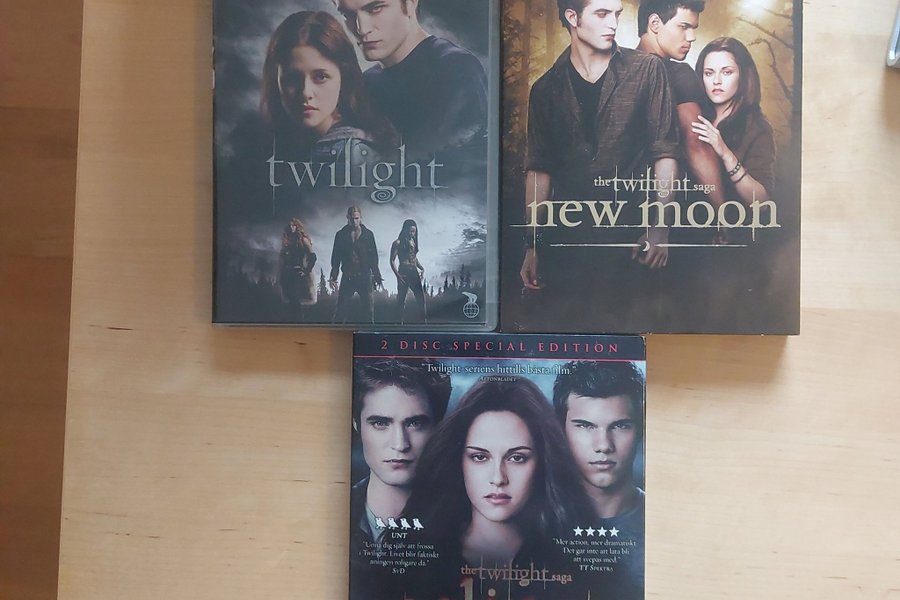 Komplett samling av de tre första filmerna i Twilight-sagan: Twilight, New Moon och Eclipse. Alla filmer är i DVD-format och i fint skick. Perfekt för Twilight-fans!