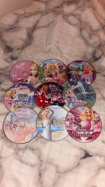 9 Barbie DVD-filmer. Titlar inkluderar ”Barbie Nötknäpparen, Barbie och de 12 dansande prinsessorna, Barbie ett modeäventyr, Barbie i svansjön, Barbie Pegasus förtrollning, Barbie som öprinsessan och Barbie presenterar Tummelisa. Förekommer repor på skivorna, men inget som påverkas, spelas i bra skick. Kommer i plastskydd (utan fodral).