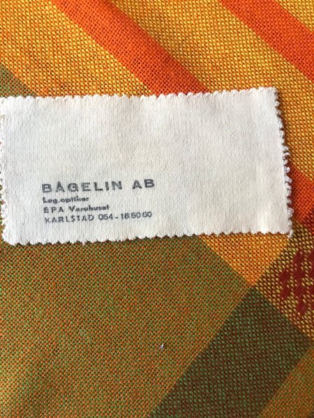 Gul tygetikett med texten "BÅGELIN AB Leg.optiker EPA Varuhuset KARLSTAD 054-18 50 60".