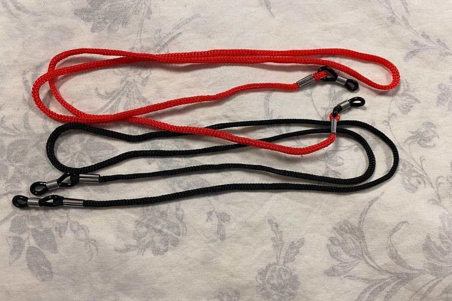 Två glasögonband i färgerna röd och svart.