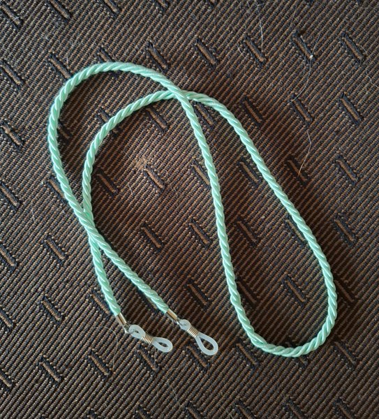 Glasögonrem i mintgrön färg. Remmen är tvinnad och har fästen i silverfärg med vita gummiöglor för att säkert hålla glasögonen på plats. S k senilsnöre.