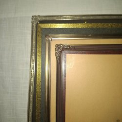 En oval ram med en brun träram med ett vackert guldinlägg. På baksidan finns en upphängningsanordning och extra spikar. Ca 24,5*30,5 cm, samfraktar gärna. Fint skick för sin ålder, en del mindre slitage finns.