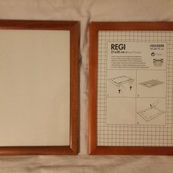 Ramar i trä. En ram är vitmålad. Ramarna är i storlek 15*11,17*11.5 och 17,5*2 yttermått i cm.