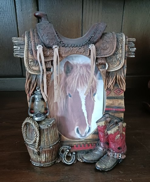Fin liten fotoram för stående placering. höjd 24 cm, bredd 18 cm. Dekorerad med westernsadel , boots, tunna och lasso m.m