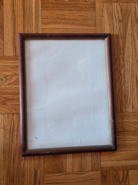 Fotoram i trä med en guldfärgad innerkant. Mått i ytterkant 43 x 33 cm. Ramen har fått skavmärken från att den legat emot andra saker. Lämplig för ommålning. Ingen anmärkning på glaset.