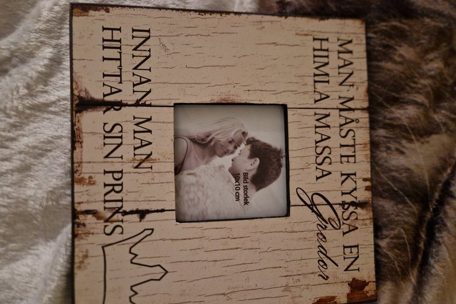 Fotoram med plats för ett foto i storlek 10x10 cm. Texten på ramen lyder "Man måste kyssa en himla massa grodor innan man hittar sin prins".